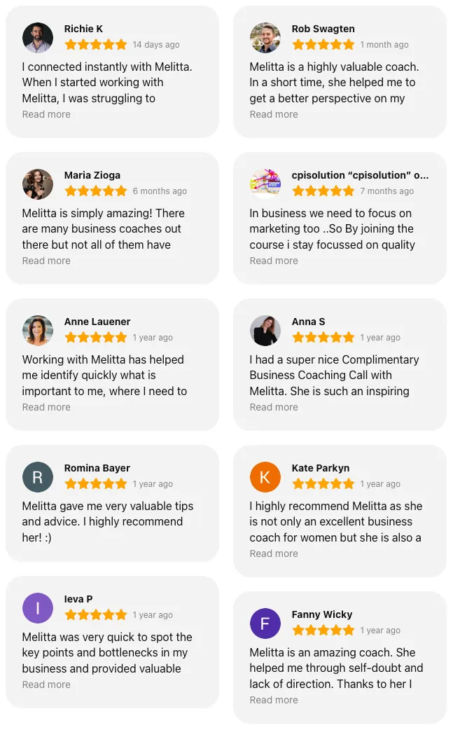 “Melitta has become the best investment in my business. The personal attention she provides should be the standard for business coaches.”